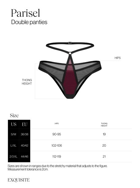 La Culotte double Parisel en bordeaux et noir allient design contemporain et confort luxueux. Confectionnées en filet de qualité supérieure, cette culotte offre un toucher doux et délicat sur la peau. L’élégante fermeture à lanières au dos ajoute un détail raffiné et sophistiqué, rendant cette culotte à la fois élégante et confortable.