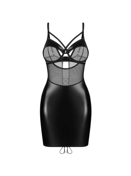 Une nuisette et un string fabriqués à partir d’une combinaison de tissu semblable au cuir et de maille transparente. La coupe ajustée avec un laçage à l’arrière accentue la taille, tandis que les bretelles d’encolure ajoutent une touche audacieuse. Les bonnets à armatures façonnent le buste, et le string assorti complète le look.